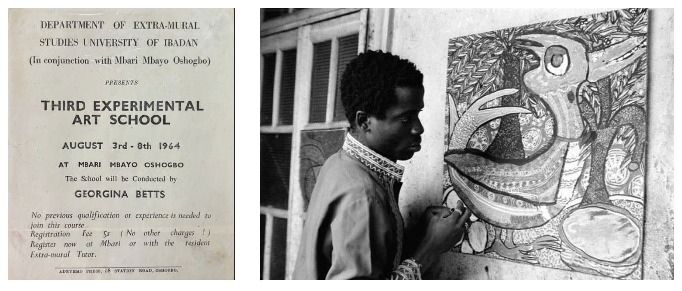 In August 1964, Georgina Beier organised the Third Experimental Art School in Osogbo. Anyone curious to try art could join, and the open invitation drew in many of the young people who would become the pioneers of the Osogbo Art Movement, including Twins Seven-Seven, Jimoh Buraimoh, Muraina Oyelami, Rufus Ogundele, Adebisi Fabunmi, and Jacob Afolabi. Twins Seven-Seven, twenty years old and without any prior artistic training, wandered into the workshop with little else to do. During the workshop, Ulli Beier singled out Twins as the most remarkable, whose “bizarre and playful imagination” he compared to Nigerian novelist Amos Tutuola. After the five-day workshop, Georgina selected a small group of participants to continue working together as full-time studio artists. Supported with small stipends, materials, and mentoring, they developed their own styles and techniques over the next two years, from 1964 until December 1966, when the Beiers left Nigeria. During this time, the artists worked in studios at the Osogbo Museum and at the Beiers’ residence, creating an environment that fostered experimentation and collaboration.