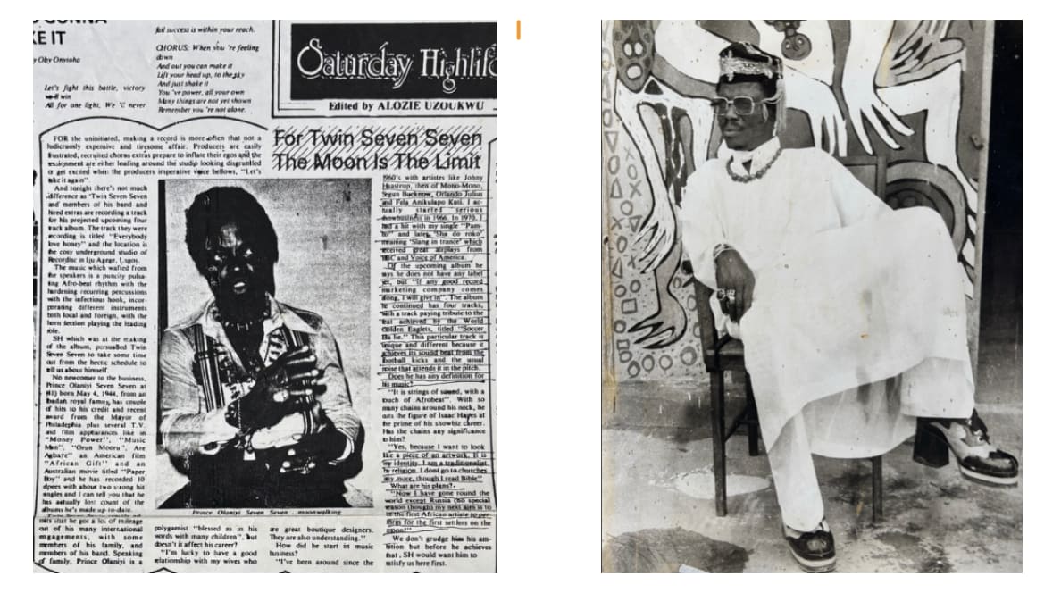 His exuberant personality extended into his personal life: known for his flamboyant fashion, he was a dancer and celebrated musician with songs that topped the radio charts. He was married to fourteen wives simultaneously, among them the artist Nike Davies-Okundaye, who built her own celebrated career. Twins’ home in Osogbo became what he called a “cultural embassy” where he regularly welcomed visiting celebrities and foreign dignitaries.Over the following decades, his work has since been included in landmark exhibitions such as Magiciens de la Terre (Centre Pompidou, 1989), The Short Century (Villa Stuck, 2005), the Venice Biennale (2024), Black Orpheus: Jacob Lawrence and the Mbari Club (Chrysler Museum of Art, New Orleans Museum of Art, and Toledo Museum of Art, 2024) and, most recently, Nigerian Modernism (Tate Modern, 2025). Today, Twins Seven-Seven is remembered as one of the most original figures of modern African art, a self-taught visionary whose vivid imagination and energy carried Yoruba traditions into a modern global context.