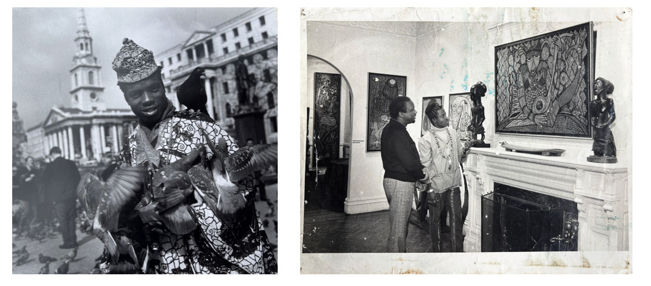 Born Taiwo Olaniyi Oyewale-Toyeje Oyelale Osuntoki in 1944 in Ogidi, Nigeria, he was the only surviving child of seven sets of twins, all of whom died in infancy. His survival marked him as an abiku child—a child “born to die,” believed to be one of a tribe of spirit children. His unusual lineage gave rise to the name “Twins Seven-Seven,” or “Ibeji Meje-Meje” in Yoruba, which he adopted as a personal identity and his artistic name. As a teenager, Twins briefly attended a teacher-training college before choosing a life on the road, first joining a traveling theatre troupe and then dancing with a medicine show that toured villages selling a so-called “Superman Tonic”. It was while traveling with this group that he first arrived in Osogbo in 1962. Twins Seven-Seven first encountered Ulli and Georgina Beier in 1963 when he gatecrashed a party at the Mbari Mbayo Club in Osogbo. Ulli Beier, a German professor and writer who taught at the University of Ibadan’s Department of Extramural Studies, and Georgina (then Georgina Betts), a British artist, were instrumental in creating Mbari Mbayo as an experimental cultural space. So struck was Ulli Beier by his charisma that he offered to top the wages Twins Seven-Seven had been earning on the road, assuring him that a place could be found for his talents in Osogbo.