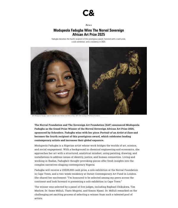 20 - 23 Feb 2025Tofo Bardi Layo Bright Diana Ejaita Ngozi-Omeje Ezema Modupeola Fadugba Ozioma Onuzulike kó is pleased to participate at the Investec Cape Town Art Fair, February...Read more -